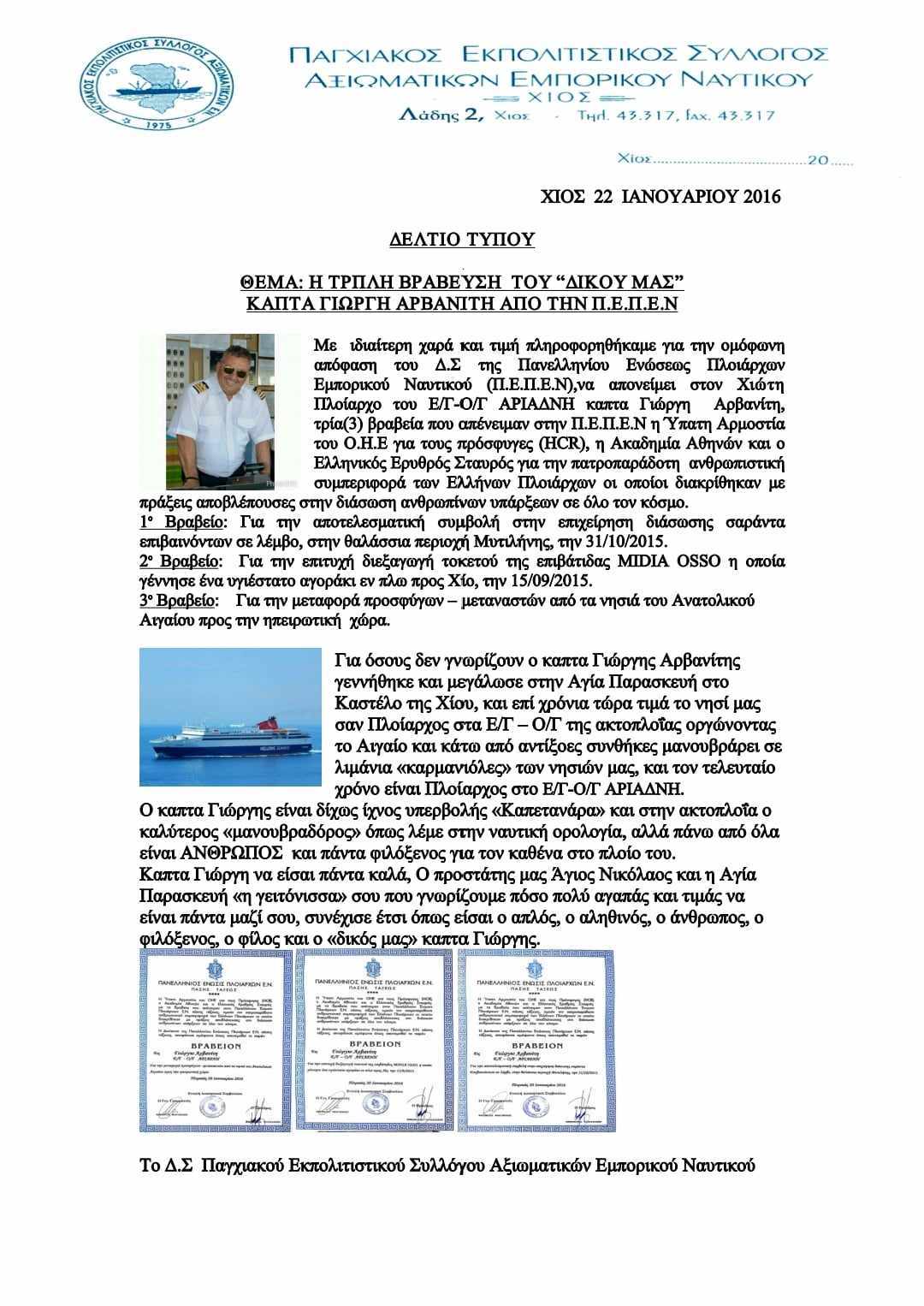 Ο Cpt Γεώργιος Αρβανίτης είναι Πλοίαρχος Α’ του Εμπορικού Ναυτικού, απόγονος Μικρασιατών από την Αγία Παρασκευή του Καστέλου Χίου, με τουλάχιστον τρεις δεκαετίες στο χώρο της ακτοπλοΐας. Καθ’ όλη την διάρκεια της πορείας του έχει αφιερώσει όλες του τις δυνάμεις ώστε να προσφέρει τόσο σε επαγγελματικό όσο ανθρωπιστικό επίπεδο με οποιοδήποτε δυνατό τρόπο.